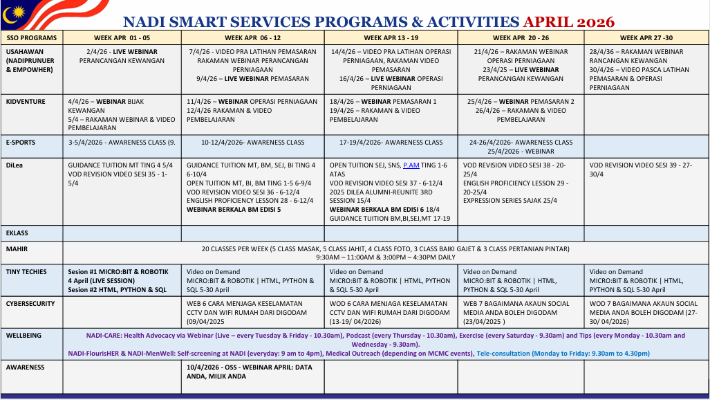 TARIKH : 02 APRIL 2026 MASA : 10.00 PAGI – 12.00 TENGAHARI TEMPAT: NADI PARIT 11 HUTAN MELINTANG PESERTA: 4 ORANG OBJEKTIF Gambar disini: https://parit11hutanmelintang.nadi.my/usahawan-webinar-7-perancangan-perniagaan/