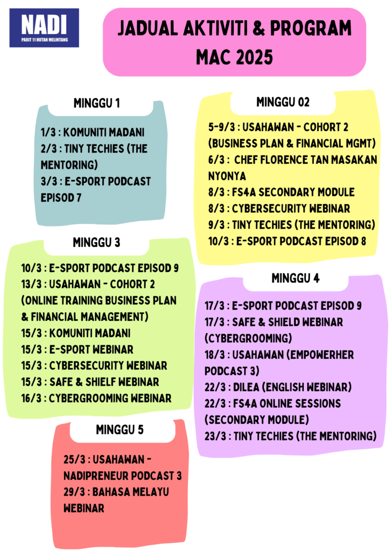 Tarikh : 22 Februari 2025 Masa : 10.00 pagi hingga 11.00 pagi Tempat : NADI Parit 11 Hutan Melintang Objektif Webinar :