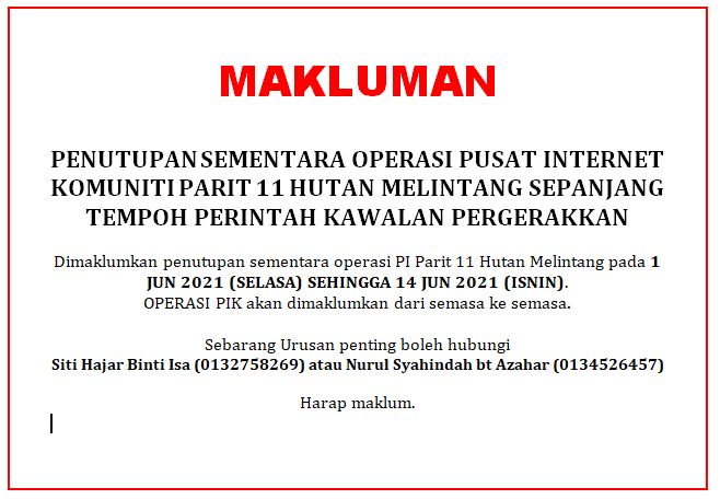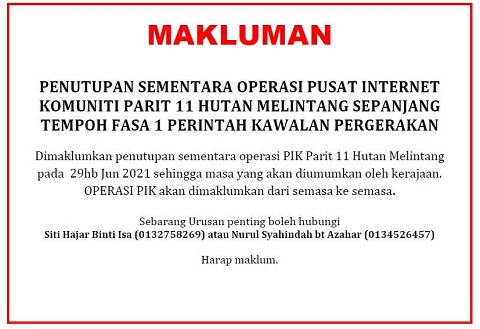 Untuk pengetahuan semua, PIK Parit 11 kini menyediakan servis percuma iaitu memberi penerangan dan membantu komuniti untuk mendaftar vaksinasi melalui aplikasi MySejahtera. Anda boleh datang ke PIK untuk mendapatkan maklumat lebih lanjut. #LindungDiriLindungSemua