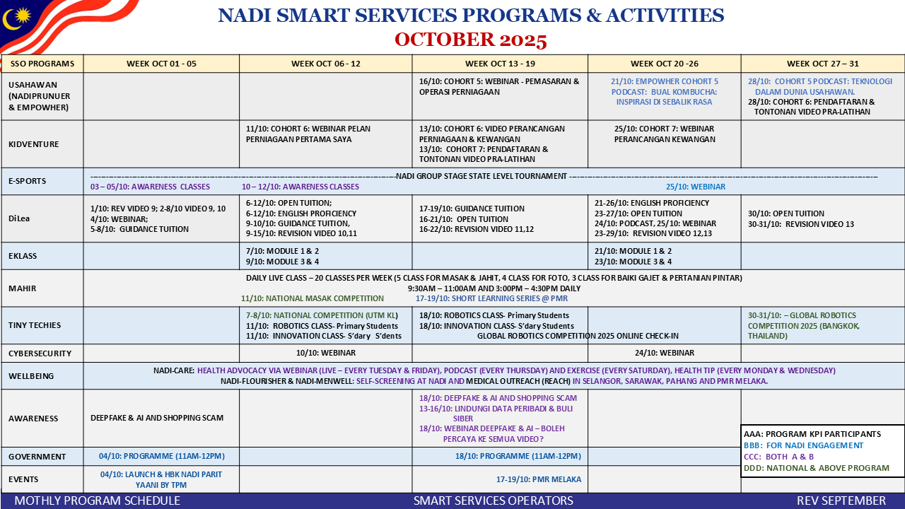 TARIKH : 27 SEPTEMBER 2025 MASA : 2.30 PETANG – 4.30 PETANG TEMPAT: NADI PARIT 11 HUTAN MELINTANG PESERTA: 2 ORANG TUJUAN Gambar disini: https://parit11hutanmelintang.nadi.my/dilea-webinar-berkala-bahasa-melayu-edisi-4/